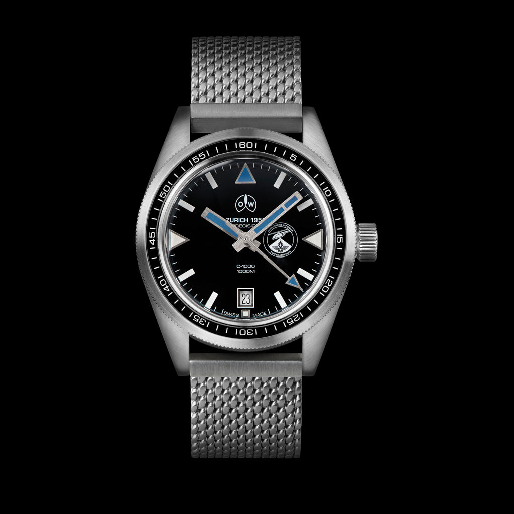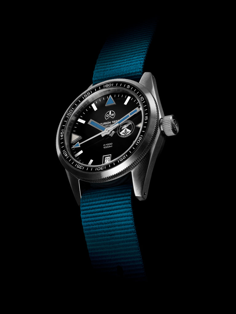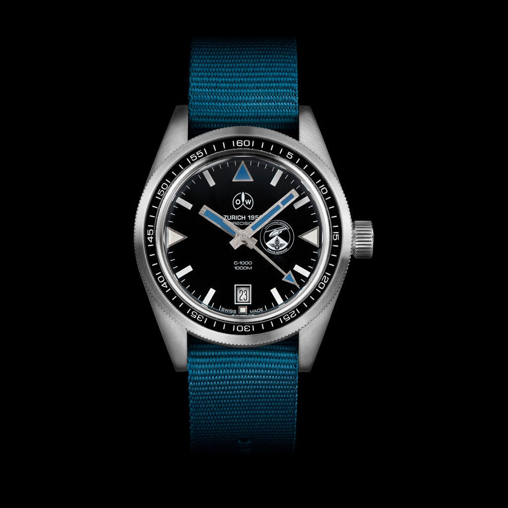 Chosen for the quality of its movement, its robust characteristics and outstanding water resistance, the OW C-1000 was customised to FAGN’s own specifications. The diver’s bezel was replaced with a bespoke 60-minutes navigation bezel and the watch was equipped with a lightweight, single piece military-grade nylon strap, inspired by the FAGN pilot’s iconic blue flying suits. A custom blue Super-LumiNova® handset was fitted to the dial which was then signed with the FAGN insignia.