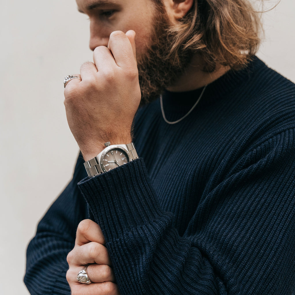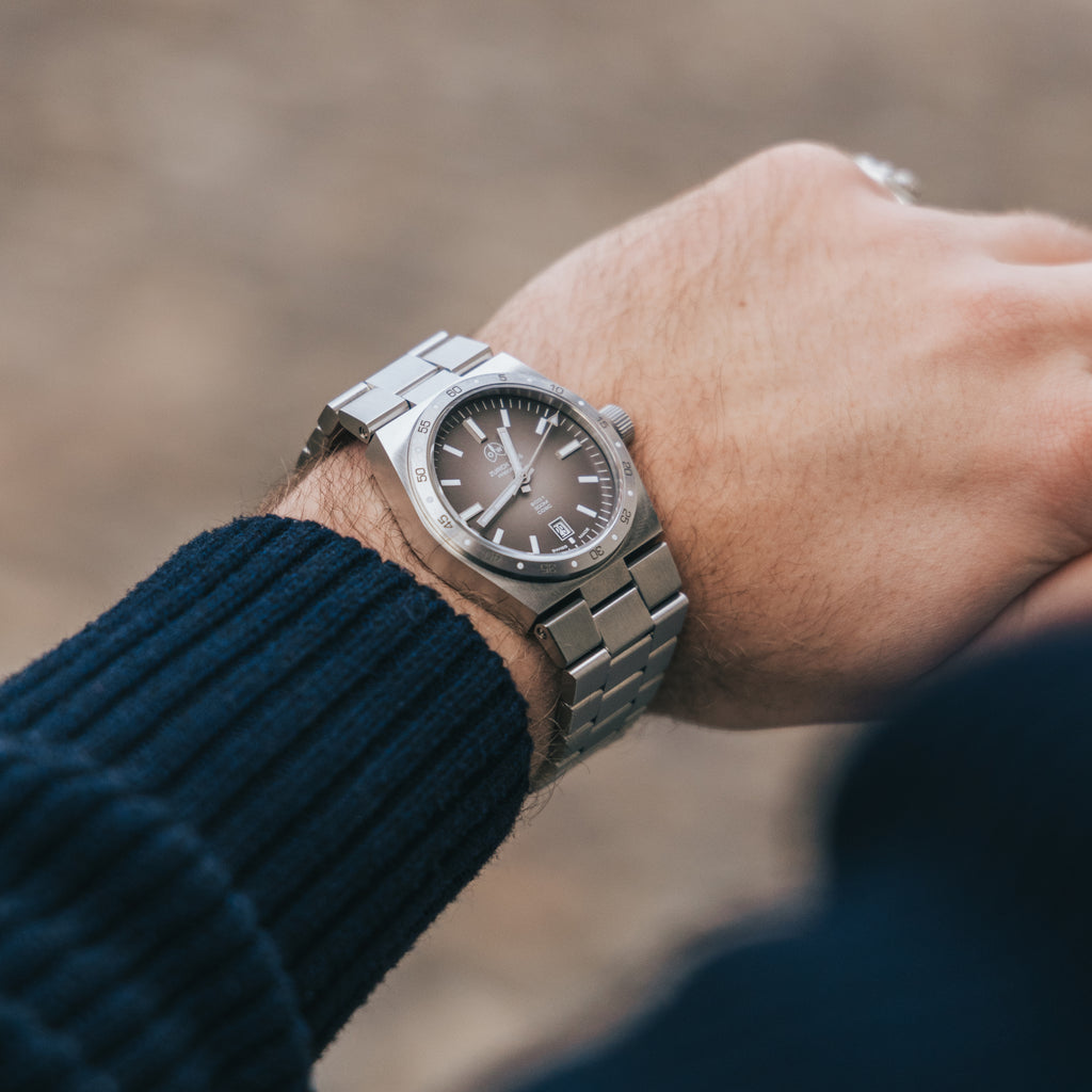 Le nom chronologique OW 8001 possède un boîtier tonneau brutaliste en acier inoxydable brossé, qui se fond parfaitement dans un bracelet intégré de style huître brossé, conçu pour une durabilité extrême et calqué étroitement sur l'original.