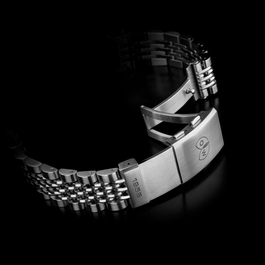 Le bracelet OW S-type Mark II en acier inoxydable effet grains de riz, inspiré de ceux des anciens modèles Ollech & Wajs de la ligne Precision des années 1960, dont l'Ocean Graph originale. Ses maillons sont usinés individuellement dans un bloc massif d'acier inoxydable 316L, avant d'être soigneusement brossés, assemblés et vissés à la main. Ce procédé évite l'étirement habituel des bracelets en acier embouti, garantissant longévité et confort. La boucle déployante à double verrouillage empêche toute ouverture accidentelle tout en restant facile à manipuler pour les plongeurs.